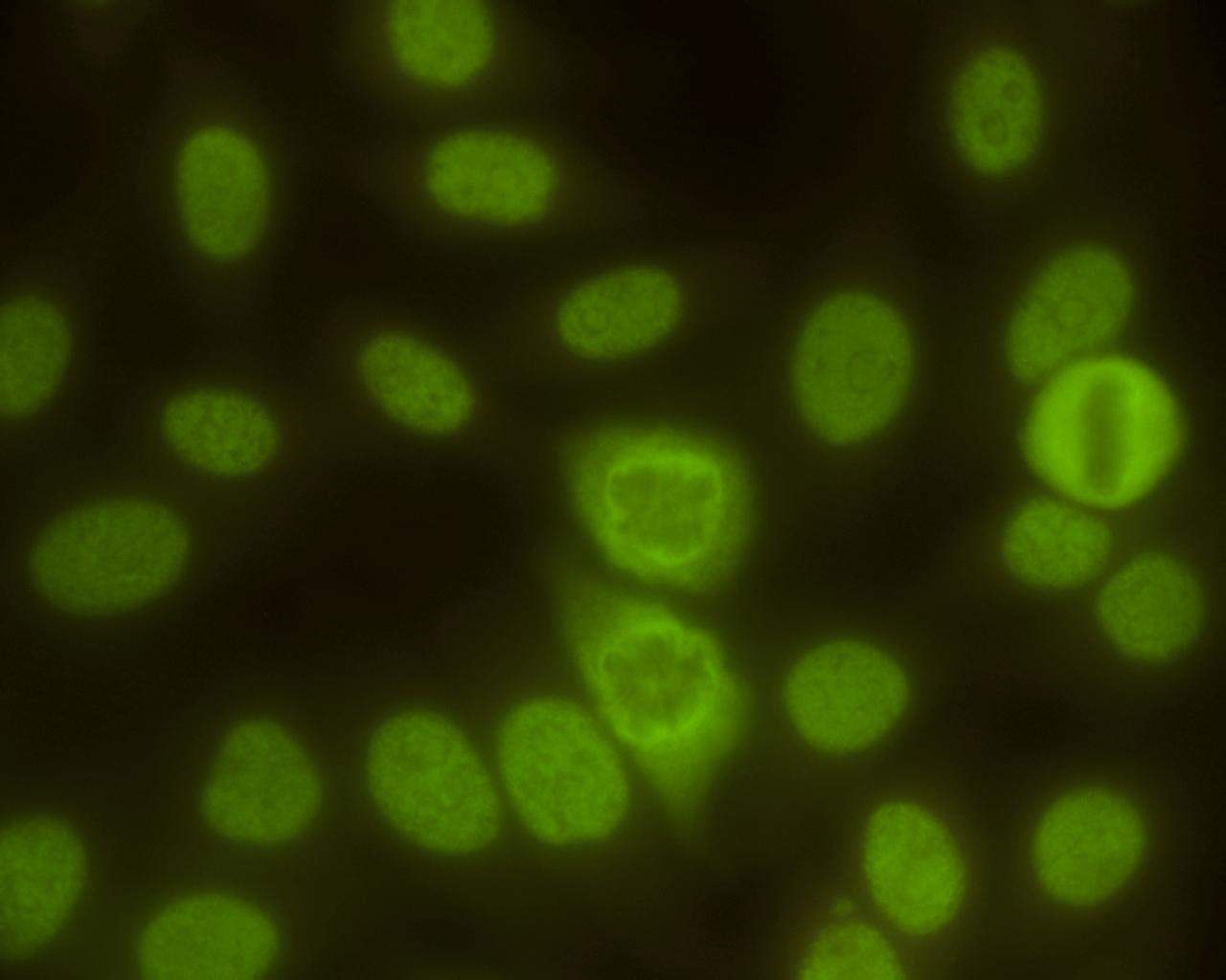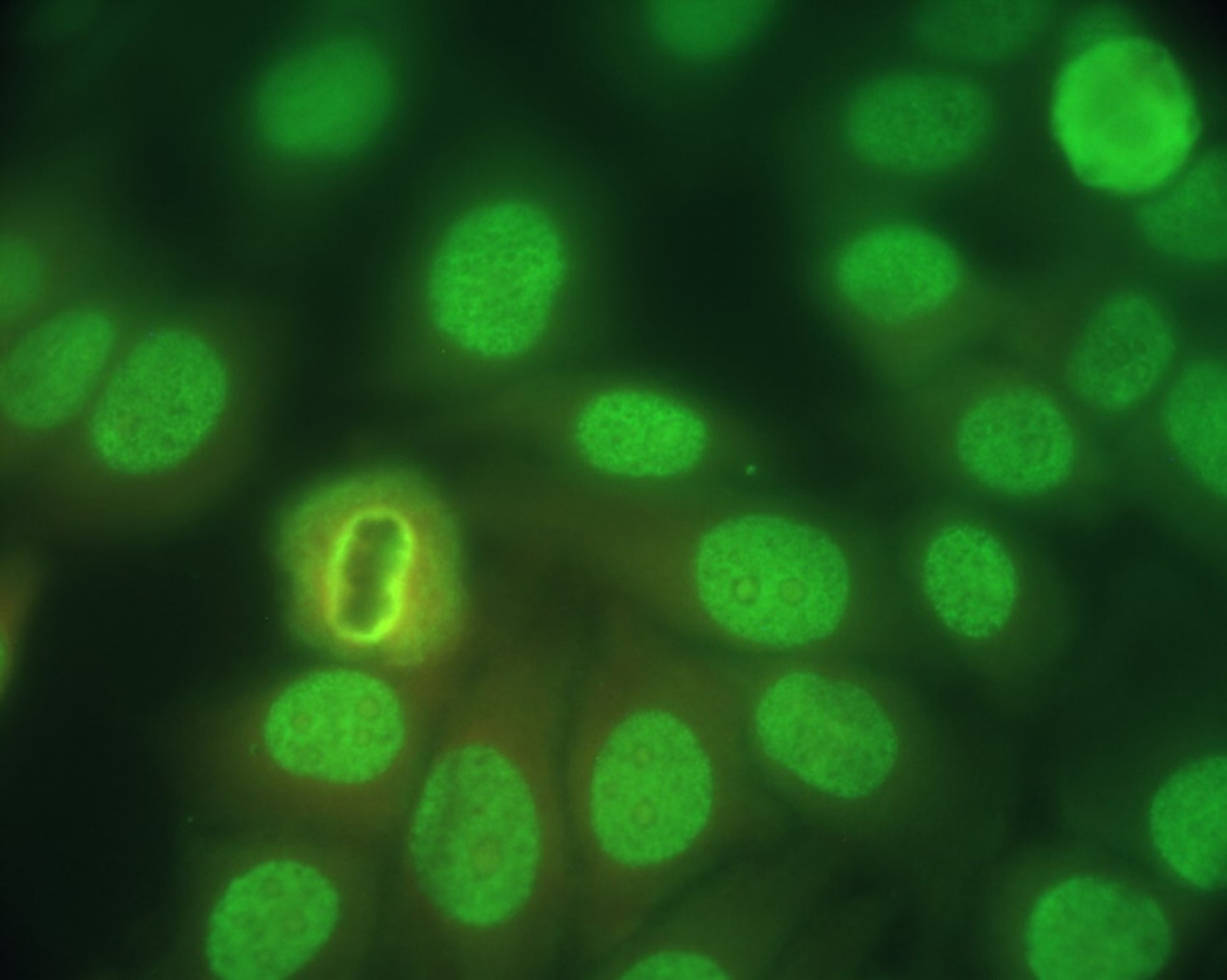 Cells in interphase with strong nuclear fine speckled staining, weak and inconstant nucleolar homogeneous staining, metaphase cells with fluorescent decoration around the metaphase plate.