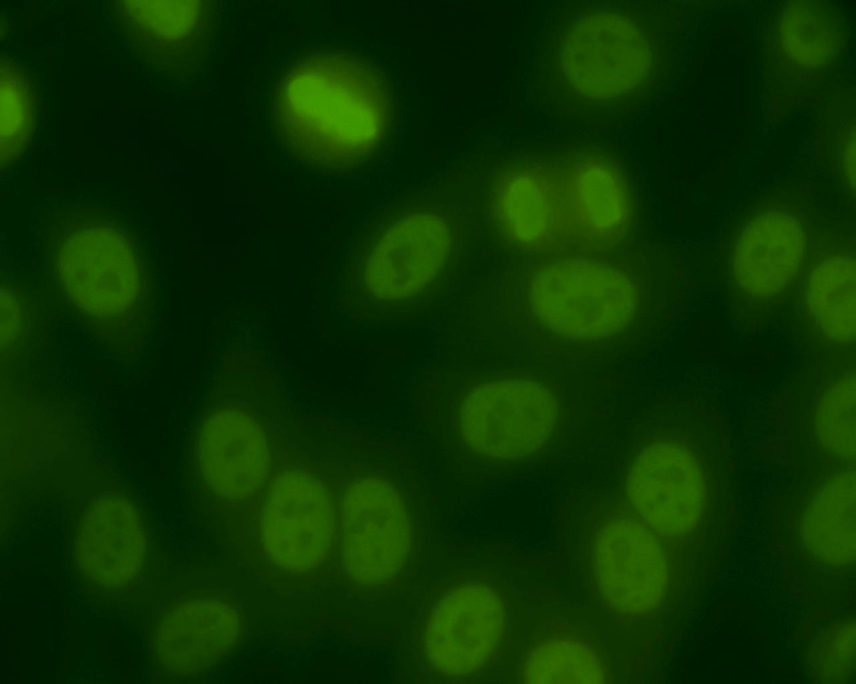 Extremely fine specked nuclear fluorescence, approaching the homogeneous texture, with the metaphase plate similarly stained.